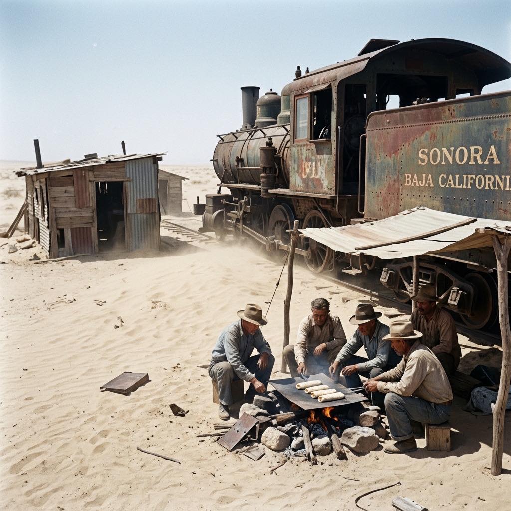 En los años en que el ferrocarril Sonora–Baja California avanzaba a paso de mula —literal y figuradamente—, los campamentos de los trabajadores eran pequeñas islas de humanidad en medio del desierto. Allí, entre rieles recién colocados, locomotoras cansadas y un sol que no perdonaba a nadie, se forjó una de las historias culinarias más queridas del norte de México: el origen del burrito.